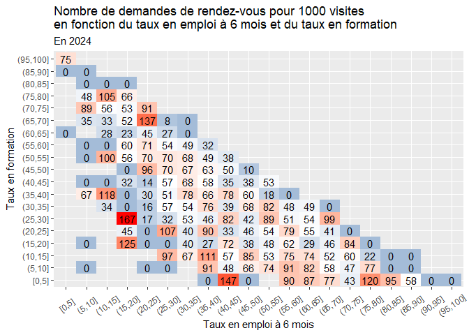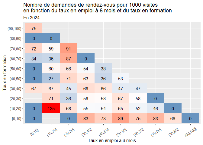 - En 2024: Les formations ayant un taux de devenir “plutôt moins favorable” ont plus de demandes de rendez-vous pour 1000 visites que les formations à taux de devenir “plutôt plus favorable” (72 contre 61).