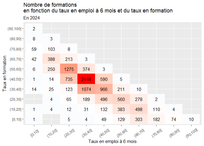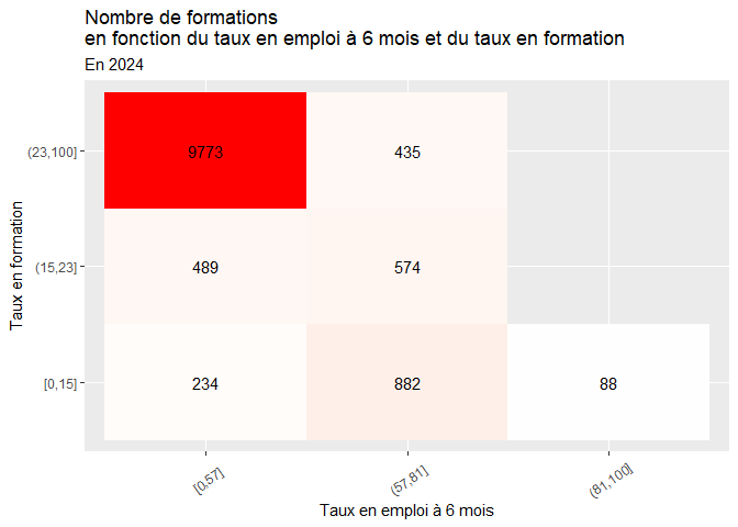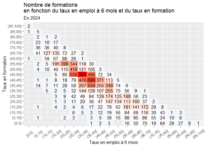 - Le taux en formation est compris entre 15 et 23% et taux en emploi à 6 mois est compris entre 57 et 81%.